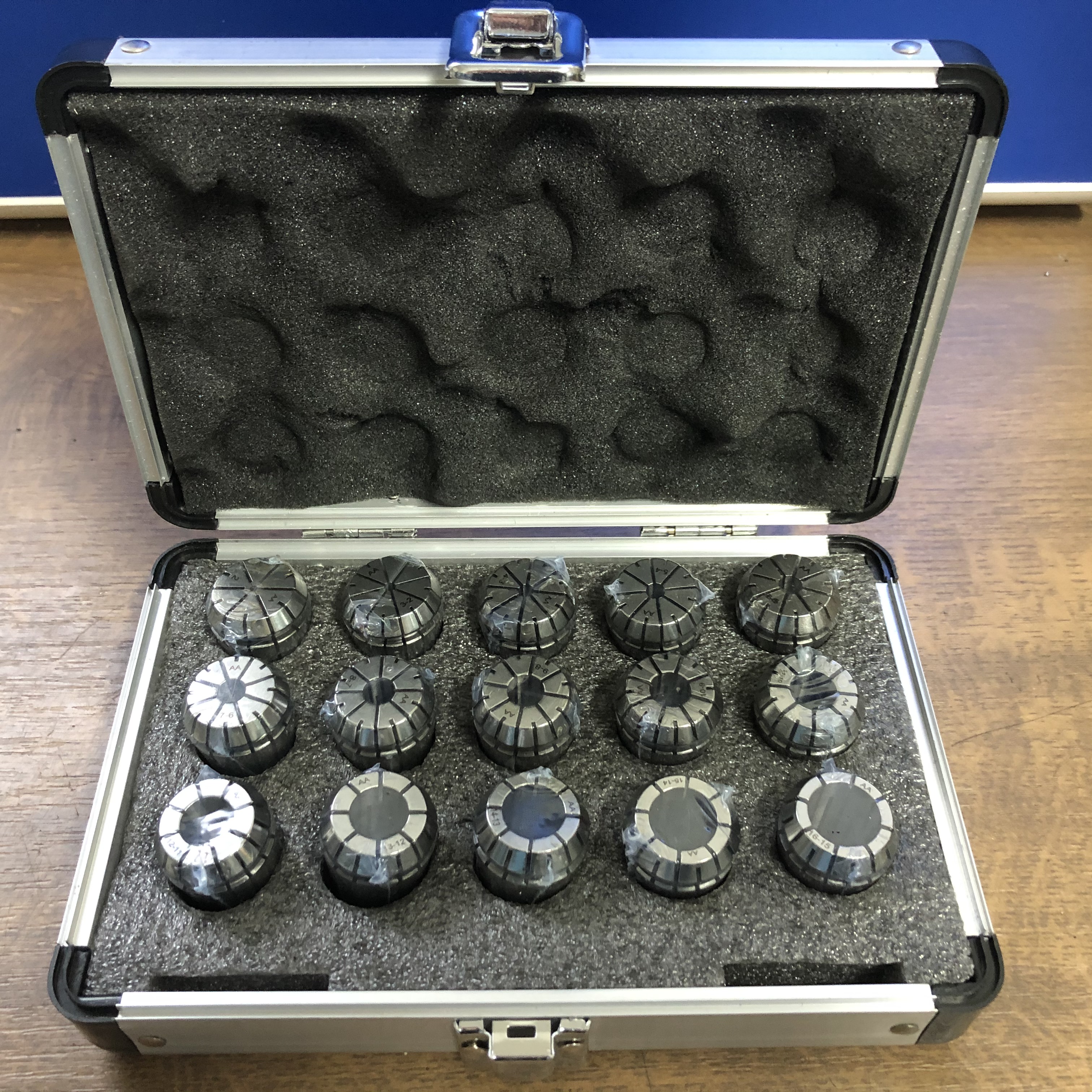 Kleštiny ER v hliníkovém boxu. Sada kleštin ER s třídou přesnosti 0,008mm