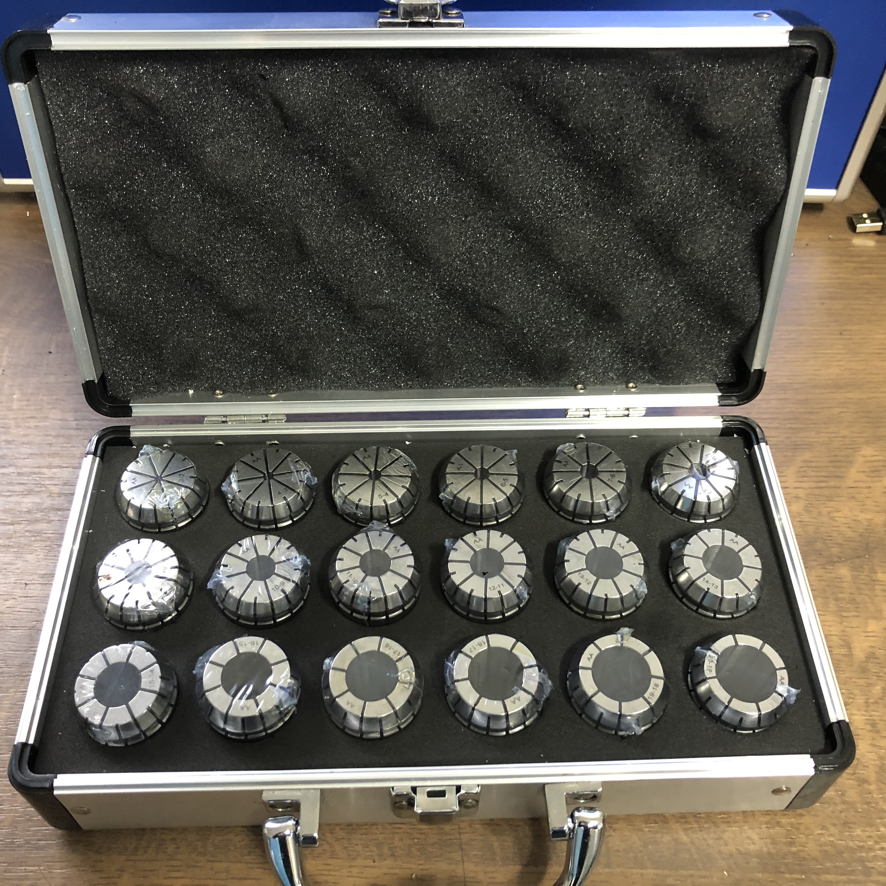Kleštiny ER v hliníkovém boxu. Sada kleštin ER s třídou přesnosti 0,008mm